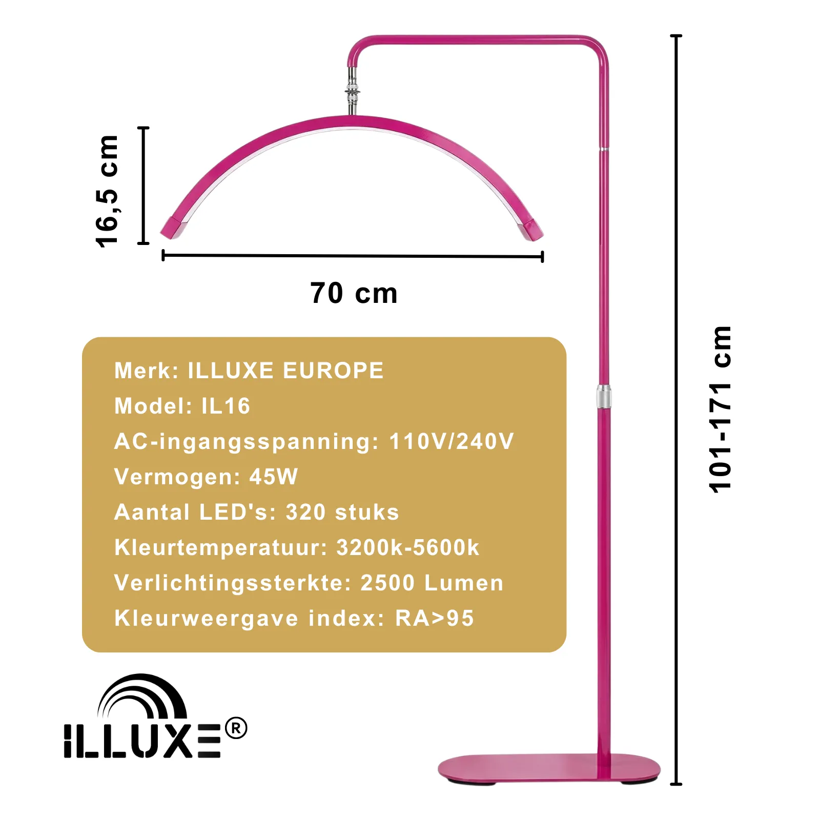 De Illuxe IL16 heeft een stijlvol en tijdloos ontwerp dat elke salon een luxe uitstraling geeft. Beschikbaar in kleuren zoals goud, zwart, wit, roze en felroze, met glitteropties voor extra flair, kan de lamp eenvoudig worden afgestemd op het interieur en de sfeer van uw salon. De 70 cm brede lampkop biedt bovendien voldoende dekking om een groot oppervlak helder en gelijkmatig te verlichten, ideaal voor precisiebehandelingen.