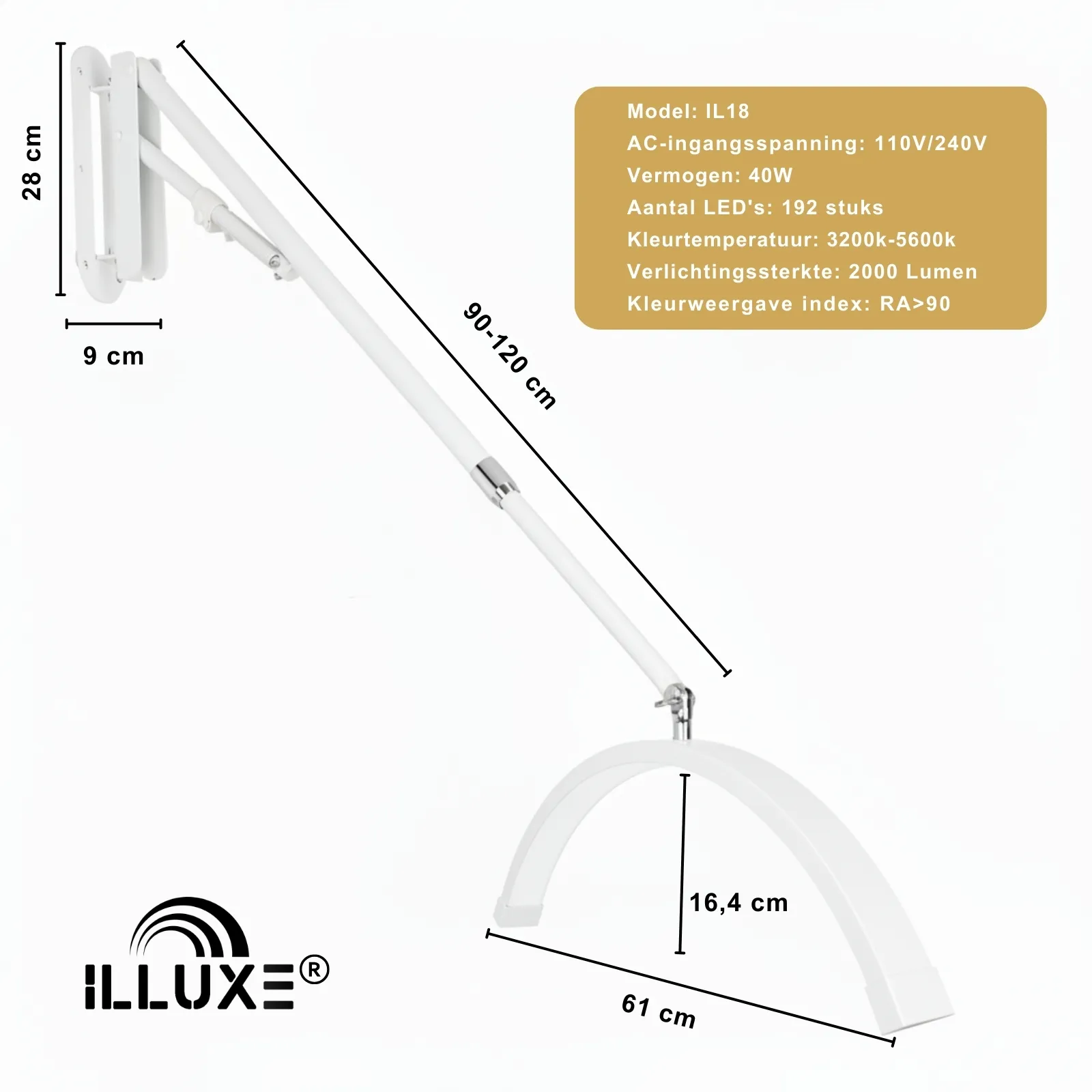 De Illuxe IL18W LED Moonlight wandlamp in wit biedt elegante, instelbare verlichting met praktische extraβs zoals een telefoonhouder. Met krachtige, flexibele verlichting en een stijlvolle uitstraling is deze lamp ideaal voor beautyprofessionals.