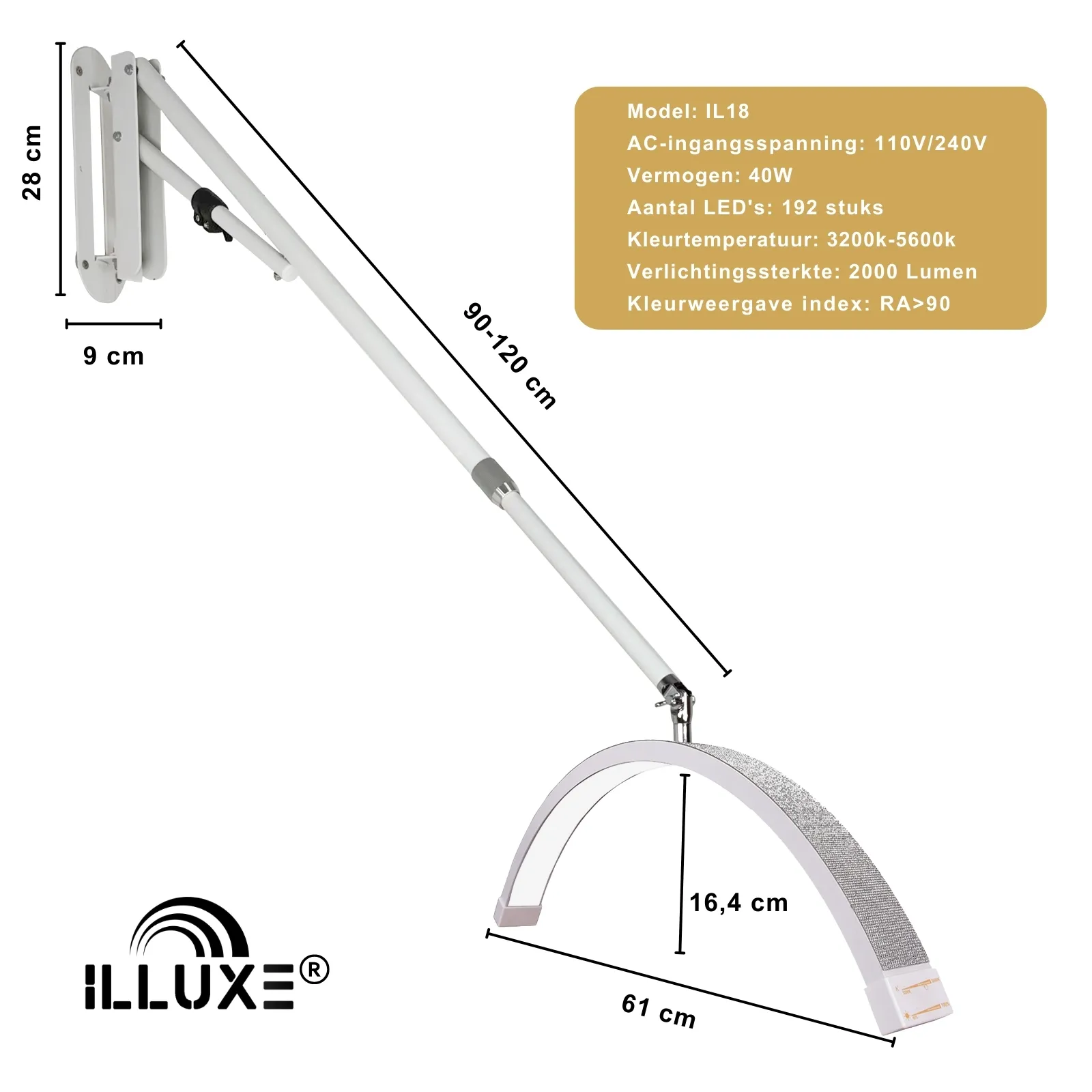 De Illuxe IL18WG is ontworpen met flexibiliteit in gedachten en biedt daarmee een scala aan positioneringsmogelijkheden. De lamp kan 180 graden kantelen en 359 graden draaien, waardoor je het licht eenvoudig kunt aanpassen aan elke specifieke behandeling. Daarnaast is de wandbeugel, ook geschikt voor plafondmontage, 180 graden draaibaar en in hoogte verstelbaar tot 125 graden. Het uitschuifbare statief, dat kan worden aangepast van 90 cm tot 120 cm, biedt extra vrijheid om de hoogte van de lamp te variΓ«ren en zo de ideale werkomgeving te creΓ«ren.