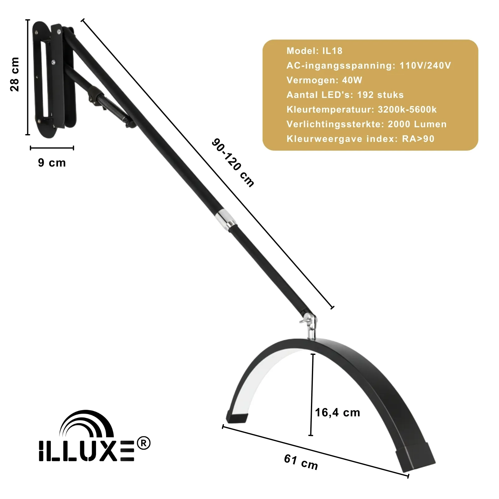 Naast een strak design biedt de Illuxe IL18Z uitstekende flexibiliteit en verstelbaarheid. Deze lamp is 180 graden kantelbaar en 359 graden draaibaar, zodat je altijd het licht kunt richten waar het nodig is. De wand- of plafondbeugel van deze lamp is ook 180 graden draaibaar en kan in hoogte worden aangepast met 125 graden voor een optimale positionering. Het uitschuifbare statief, dat kan worden versteld van 90 cm tot 120 cm, biedt extra hoogte-opties en zorgt ervoor dat je de verlichting gemakkelijk kunt aanpassen aan de situatie.