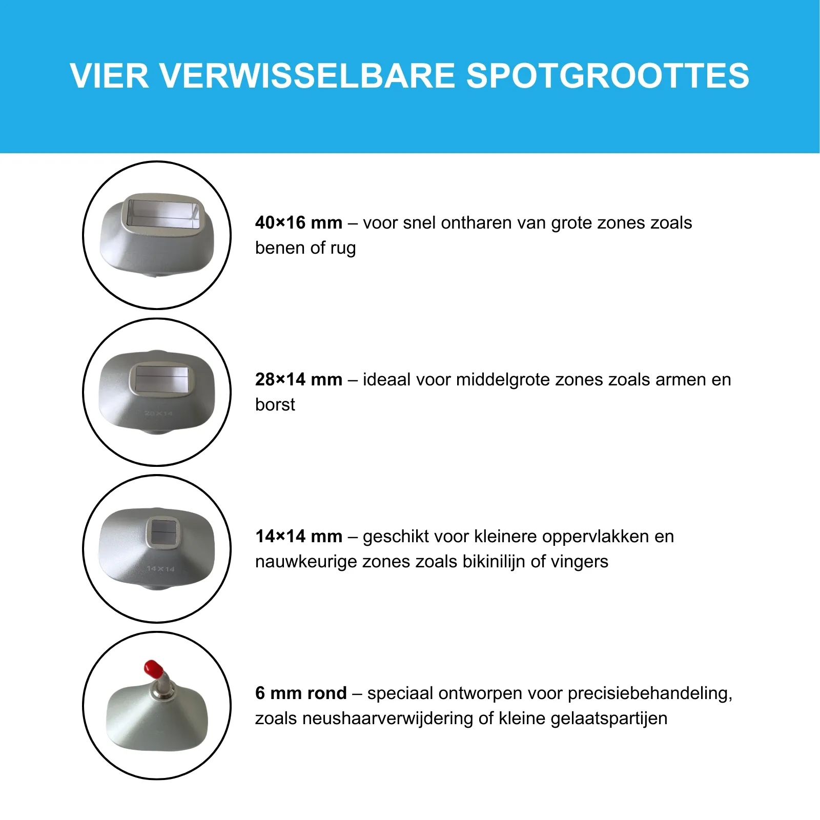- 14×14 mm – geschikt voor kleinere oppervlakken en nauwkeurige zones zoals bikinilijn of vingers